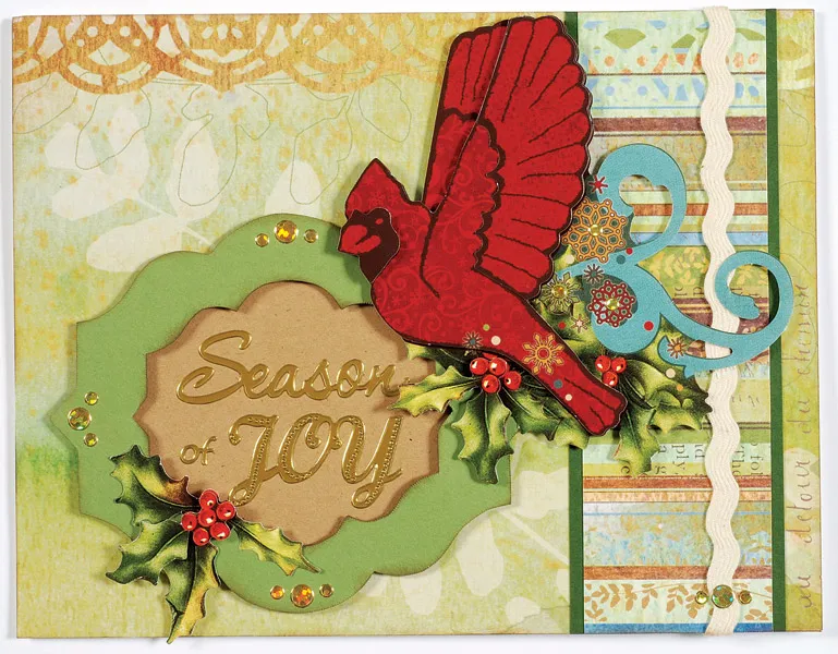 Trace and cut fancy label A from green cardstock, then cut fancy label B from the center. Trace fancy label A onto tan cardstock, then cut 1/8" inside the lines. Foam tape the green frame to the tan label, then place “Season of Joy” Dazzles™ as shown. Glue to the front in the lower left corner. Punch out the cardinal die-cuts. Follow the package directions to assemble with foam tape between the layers, using #1, #2, #3, and #5. Glue and foam tape to the card as shown.
