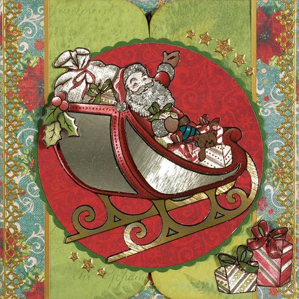Trace and cut the circle from Vintage Christmas red paper. Mat on cardstock with ¼" borders, then trim with the scallop-edged scissors. Center it on the front and glue just the left half to the left panel. Punch out the Santa die-cuts and follow the package directions to assemble, placing foam tape between the layers. Glue to the circle. Punch out and assemble the two gift die-cuts (extra art) and glue to the lower left. Place star Dazzles™ as shown.