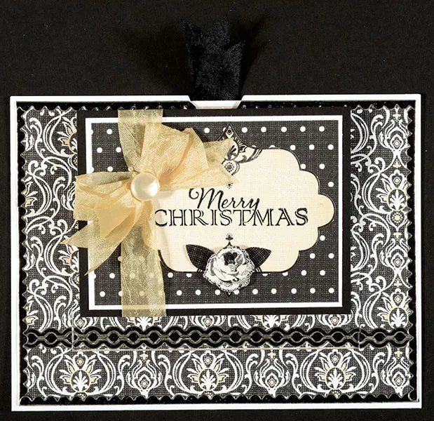 Make a 4-loop bow with ribbon and tie the center with thread. Glue the bow to the first ribbon, 1" from the pop-up top edge. Glue the button to the bow center. Place three Dazzles™ borders across the lower card front flap, cutting the borders at the flap sides. Place Dazzles™ borders around the outer edges of the black/ivory damask paper on the front. Pull up the pop-up mechanism and stamp “Fat, Jolly and Generous” in the window opening.