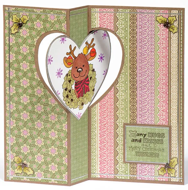 For the front: Place Dazzles™ lines along the left, top, and bottom, all 1/8" from the paper edges. Stamp “Jingle Bells” centered on the green heart. Stamp the holly cluster five times onto white cardstock with Timber Brown ink and let dry. Color the leaves with DG2, then shade near the berries with DG4, blending the colors. Cut out the clusters and set two aside. Glue three clusters on the front as shown.