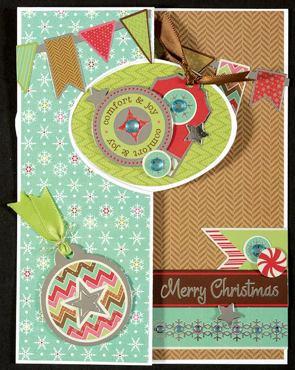 Tie brown ribbon onto the red tag. Glue the tag and foam tape the “Comfort & Joy” die-cut to the front oval as shown. Glue and foam tape the remaining die-cuts and place rhinestones as shown.