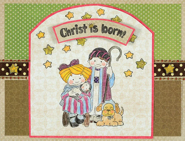 Cut a 4½”x4 ¼” Christmas Sweets tan circle paper. Use the Easy Circles Template to round off the top. Mat on Christmas Sweets red patterned paper leaving 1/8” borders. Stamp the Manger kids in black on the center. Stamp several stars above the kids. Color with watercolor pencils as follows: girl’s hair & stars 111 &108, bow, coat, hat, dress stripes 133, wrap, dress stripes, robe trim, sock, dog hat 140, chair, staff 176, dog 183 & 187, boy shoes 199, cheeks 131. Add stickles to some stars. Stamp 2 extra stars, color and cut out. Foam tape to either side of the manger scene on the ribbons. Stamp Christ is Born cut about ¼” away from the words, and mat on Christmas Sweets red paper. Foam tape to the stars.