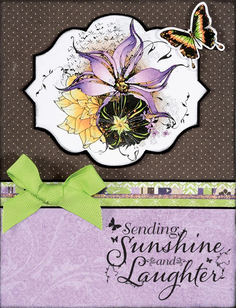 Stamp “Sending Sunshine…” on the bottom right, as shown. Zot™ on a bow of ½” green grosgrain, as shown.