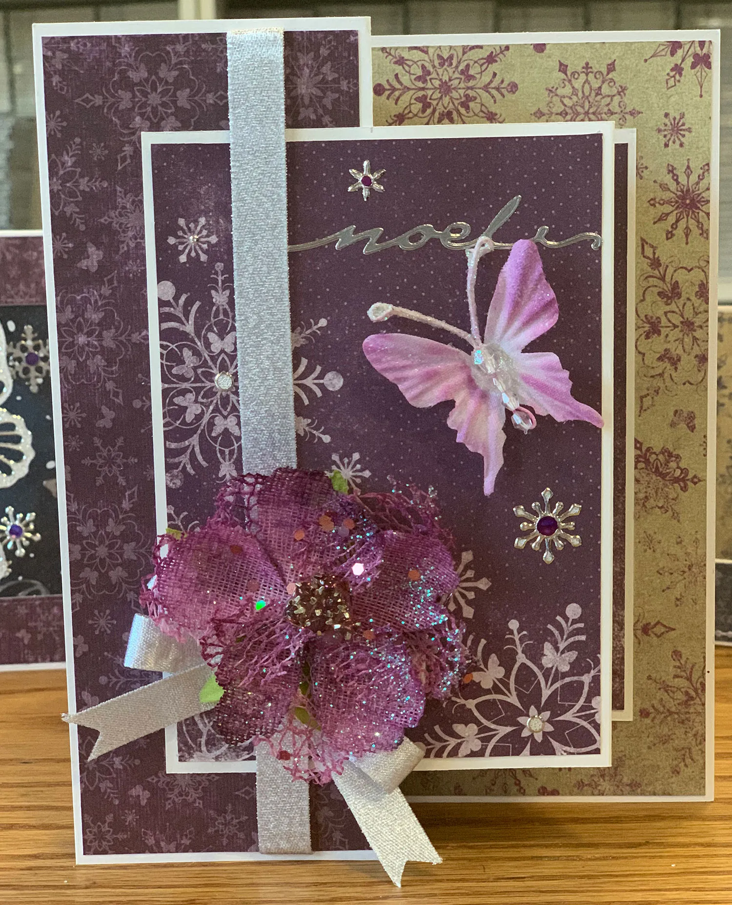 For the card: To create the S-fold card, fold the card’s right front edge back, aligning it with the fold on the left, and crease. Cut two 2 3/8"x6 3/8" Jeweled Winter’s Butterfly purple snowflake papers. Cut a 7½" silver ribbon and wrap it over one paper, ½" from the left edge, gluing the ends to the back. Glue that paper centered on the card’s front panel.