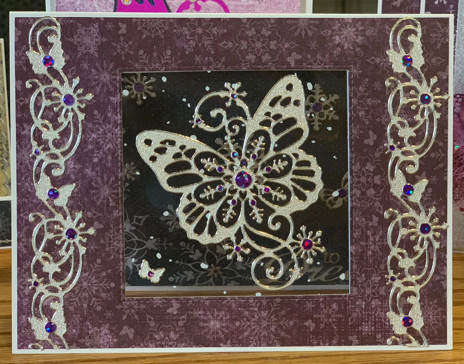 For the card: Cut 6 3/8"x4 7/8" Jeweled Winter’s Butterfly purple snowflakes paper and apply adhesive across the entire paper, then glue it centered on the front. Open the card and die cut a 3¼" window from the center front. Open the card.
