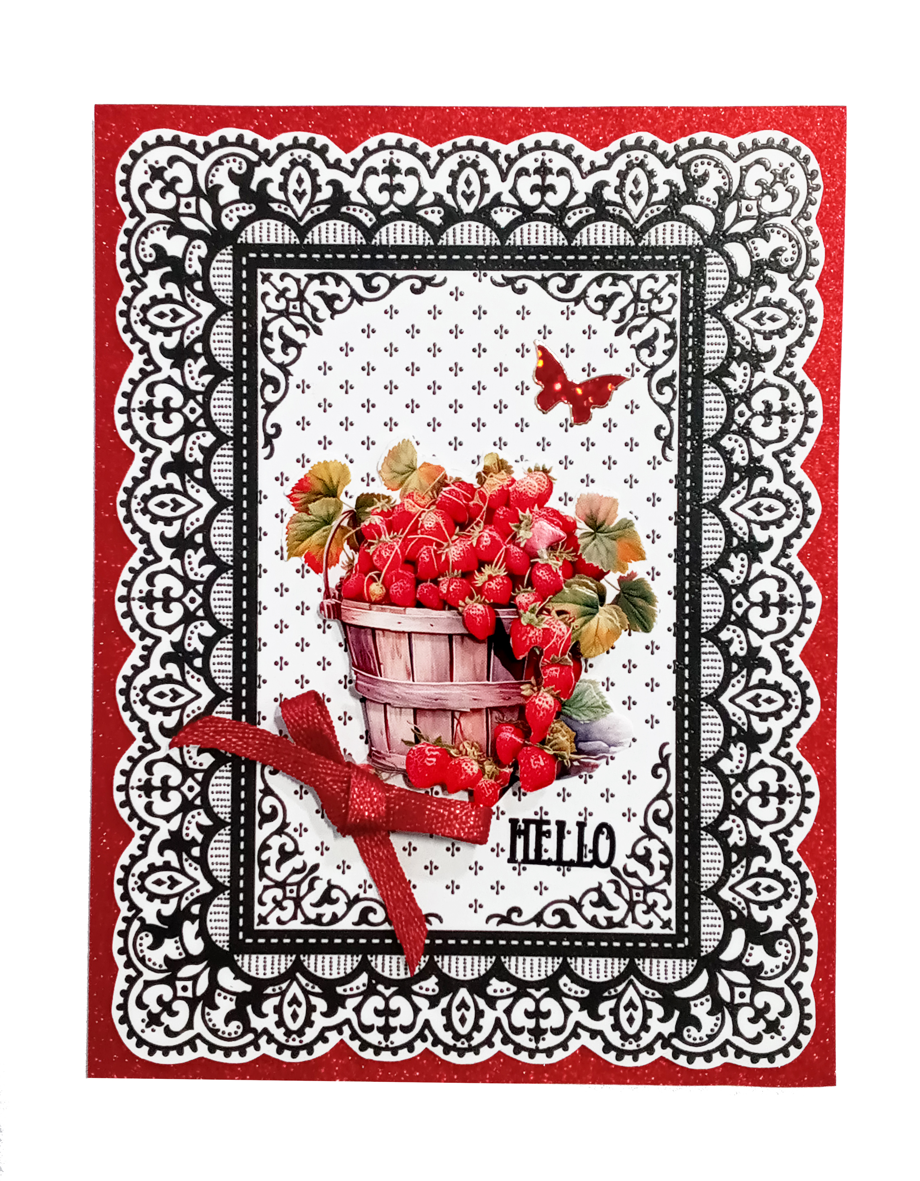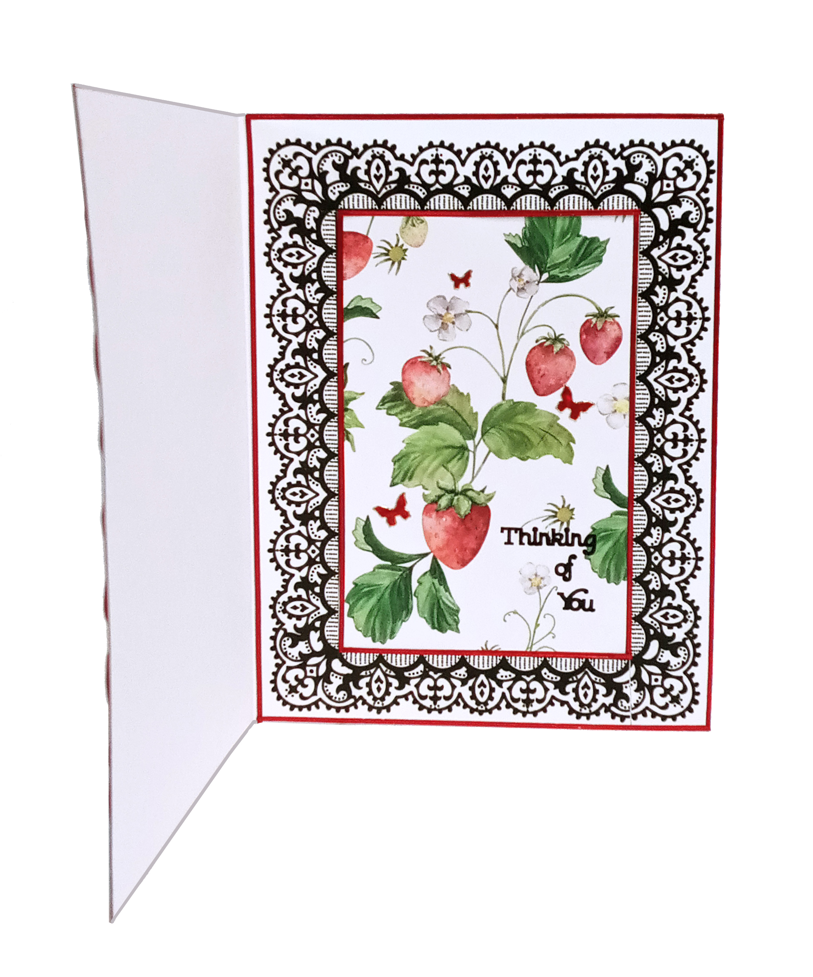4. Inside: Trim 1/8” off the long edge of the second ebony doily sheet. Cut out the center of the sheet. Position it over the Sweet Strawberries sheet shown. Trim off the excess and glue inside the card.