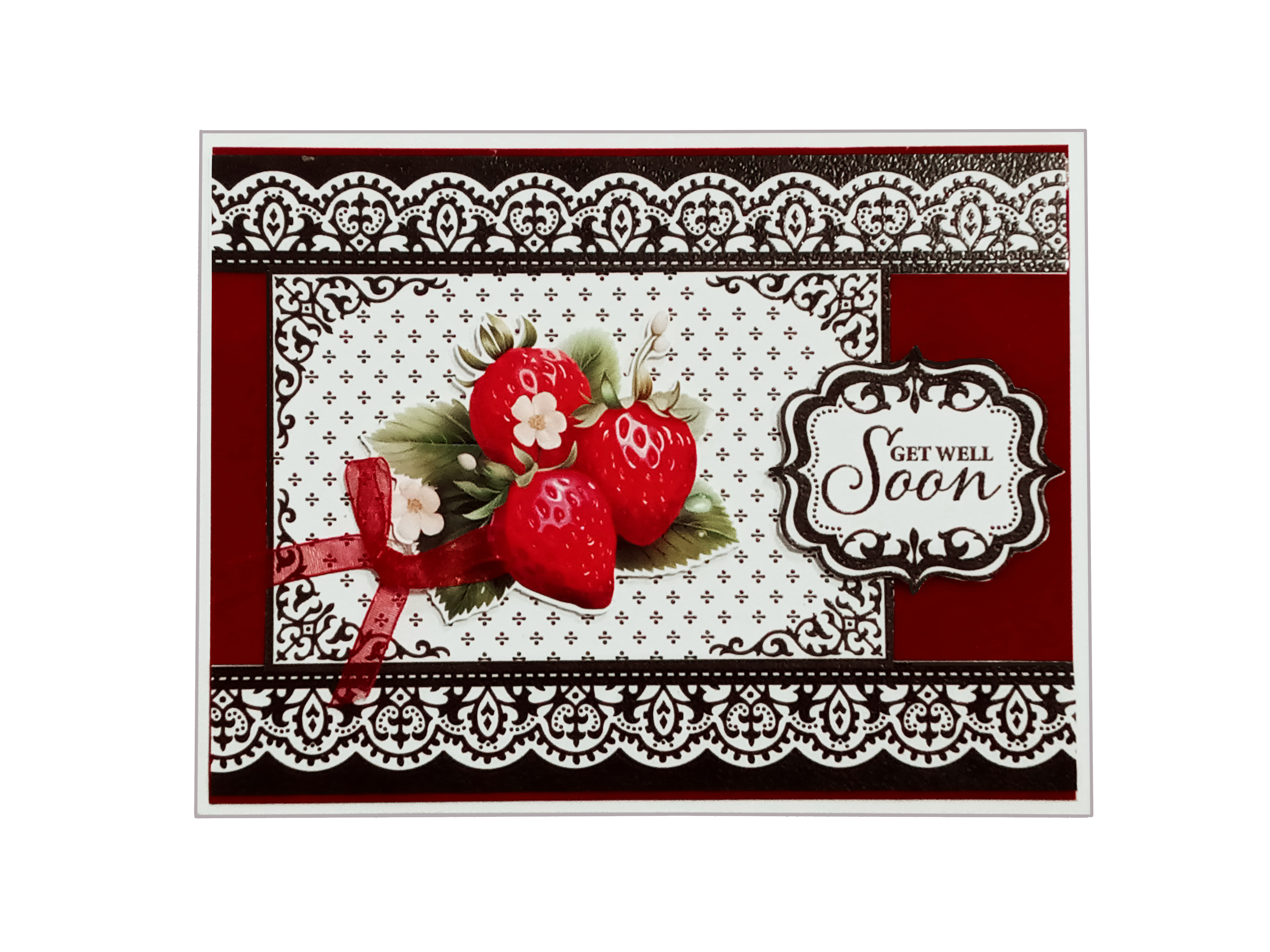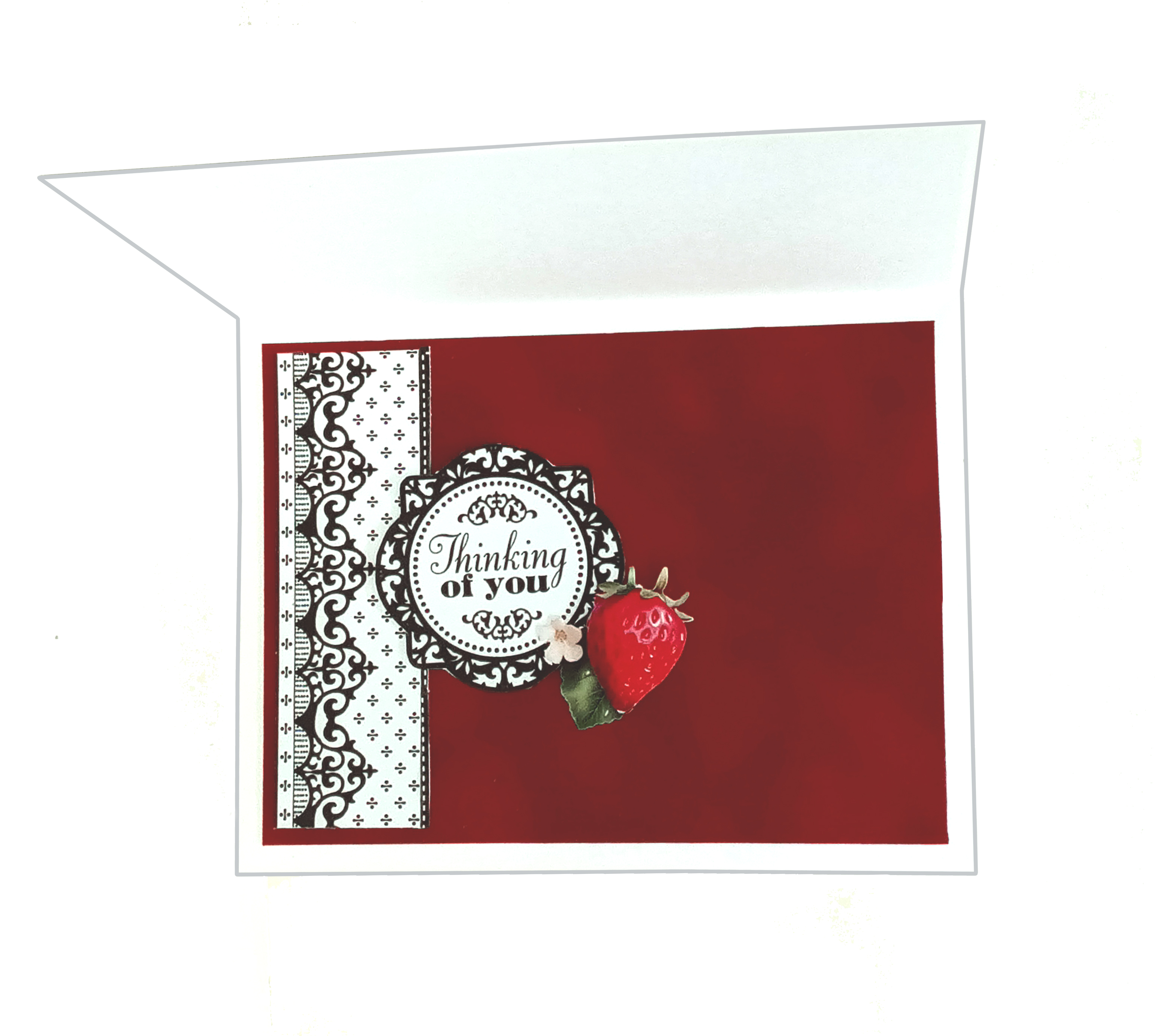 5. Inside: Use the pattern to cut light green strawberry paper. Glue the center of another paper doily as shown and trim the excess. Glue inside the card. Place red border Dazzles™ as shown. Glue two strawberry pieces along the doily. Place “live, laugh, love” Dazzles™ as shown.