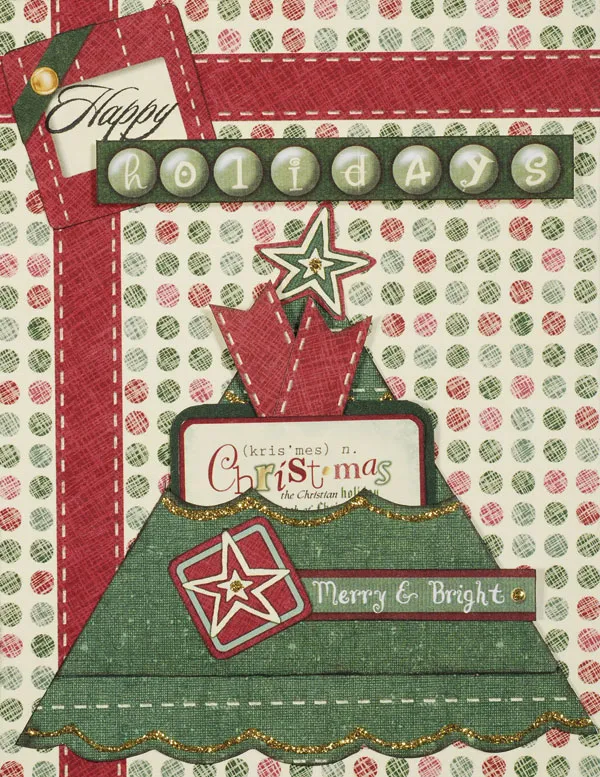 Cut out the slide mount and “holidays” art. Glue the slide mount and foam tape “holidays” as shown. Stamp “Happy” onto the slide mount. Cut out a burgundy star square and the “Merry & Bright” word art. Glue to the pocket as shown. Squeeze glitter glue in a scallop pattern along the tree's lower edge, the pocket edge, and on the upper tree section. Squeeze a glitter dot onto each star. Let dry completely.