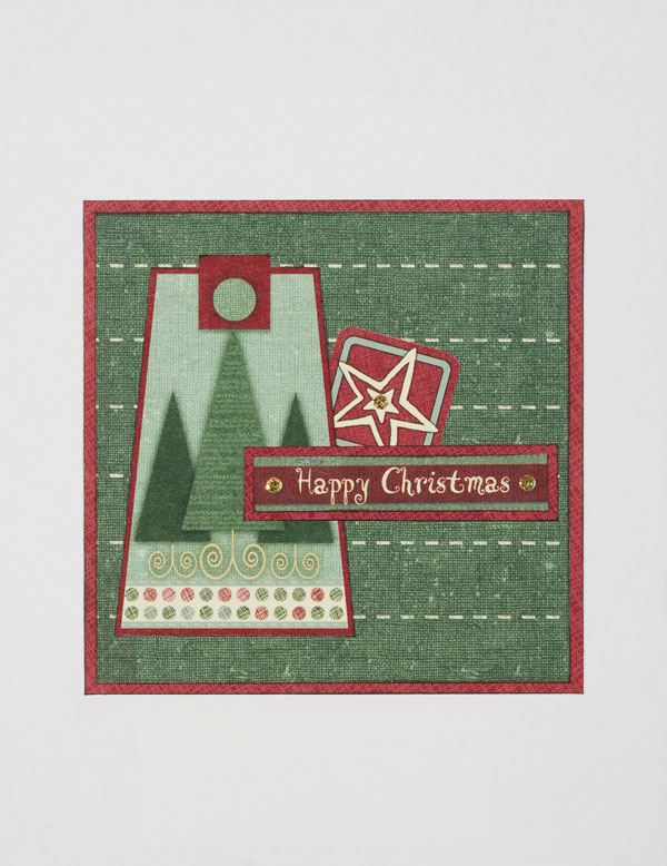 For the inside: Cut a 3½" square of green stitched paper, ink the edges and mat on burgundy textured paper. Ink the edges and glue to the inside. Cut out the trees tag, a burgundy star square, and “Happy Christmas” word art. Ink all the edges. Mat the word art on burgundy textured paper and ink the edges. Glue the pieces to the stitches square as shown. Add a glitter dot to each end of the word art and to the star. Let dry completely before closing the card.