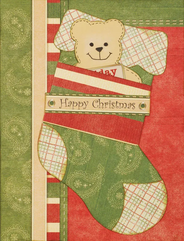 Trace and cut the stocking pocket from red/green/ivory striped paper. Fold the pocket but don’t glue yet. Trace and cut the stocking shape onto green paisley paper and cut out. Ink the edges, then glue to cover the stocking front, under the pocket. Cut the cuff, toe, and heel from ivory/green/red plaid paper, ink the edges and glue to the stocking.