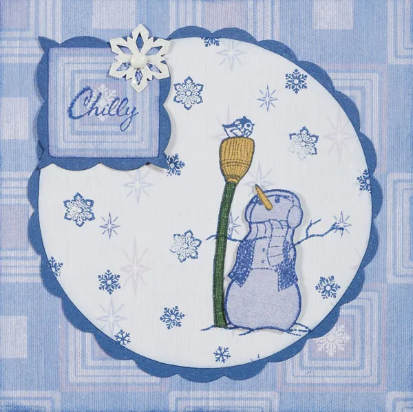 Cut one snowflake square from the blue squares paper and stamp “chilly” on the center. Mat on dark blue cardstock and scallop the edges. Glue to the circle, opposite the snowman as shown. Attach a white mini Brad Buddy™ snowflake as shown, then glue the circle centered on the card.