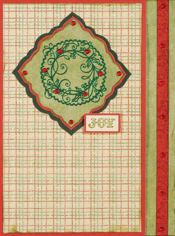 Stamp “JOY” on ivory paper and trim to ¾"x 3/8". Mat on red cardstock with 1/32" borders then foam tape to the front, positioned as shown. Place six crystals on the wreath and one in each corner of the medallion.