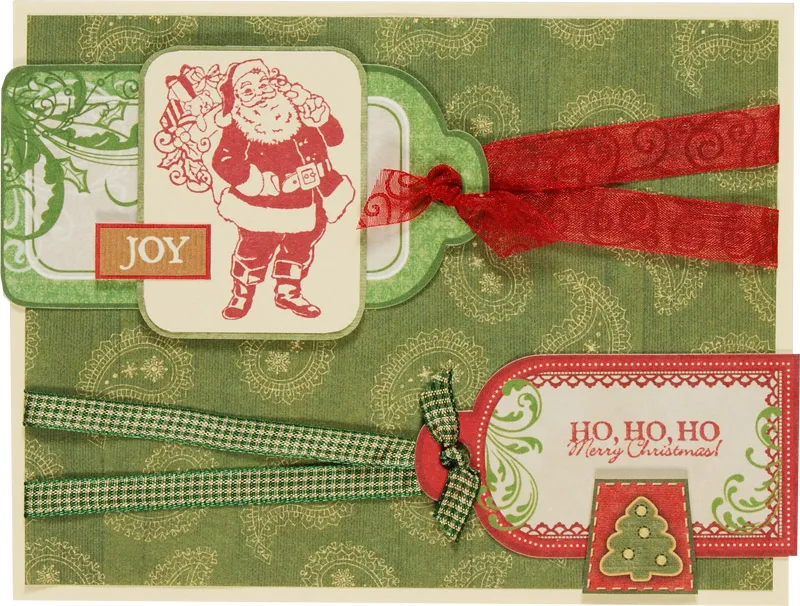 Stamp Santa on cardstock and trim to 1¾"x2¼". Round the corners, then mat on Christmas light green paper with 1/32" borders. Foam tape to the green tag. Stamp “Ho, Ho, Ho…” on the red tag. Cut out the Christmas small tree and “joy” ribbon art and foam tape as shown.