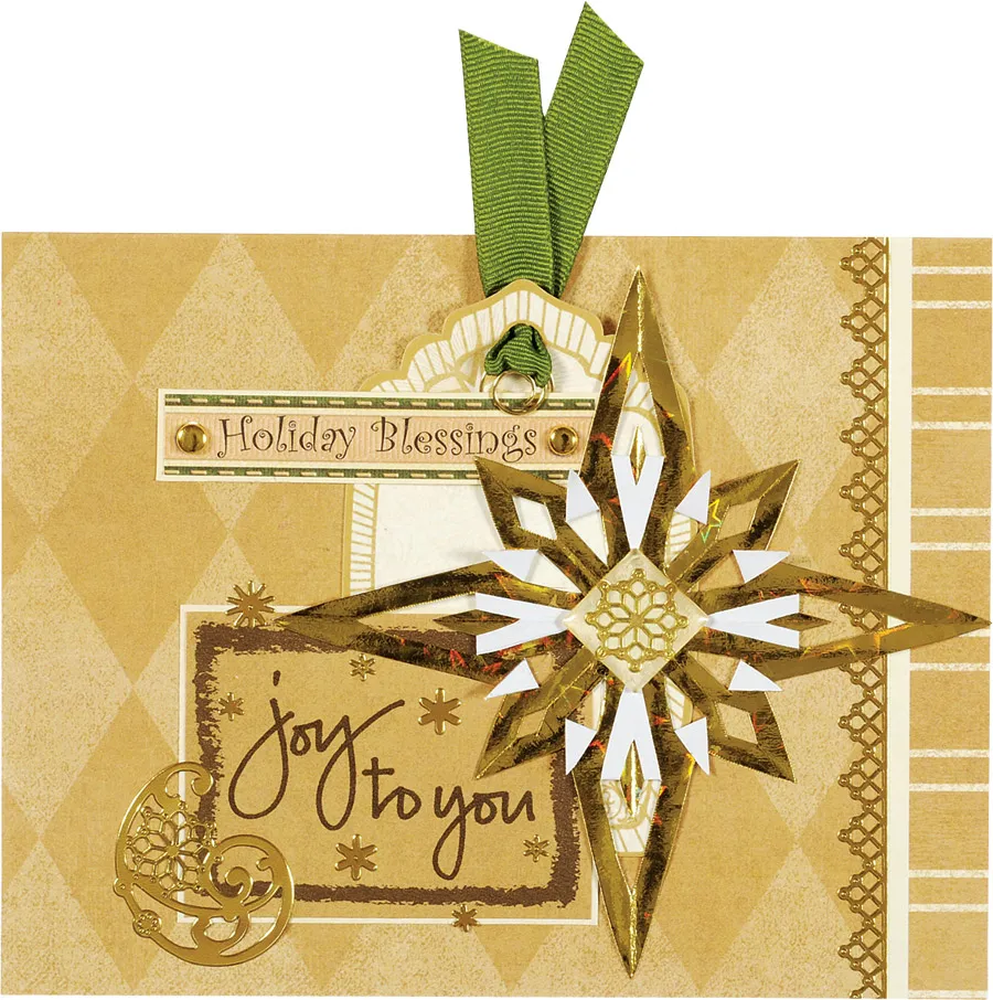 Glue the matted phrase to the card as shown. Follow the template directions to trace and cut a Kirigami large star from gold stars foil paper. Glue over the tag and phrase as shown. Place a ¾" snowflake Dazzles™ on Christmas ivory paper, then follow the Shape Studio manufacturer’s directions to create a square embellishment. Glue to the star center, then place the Dazzles™ as shown.