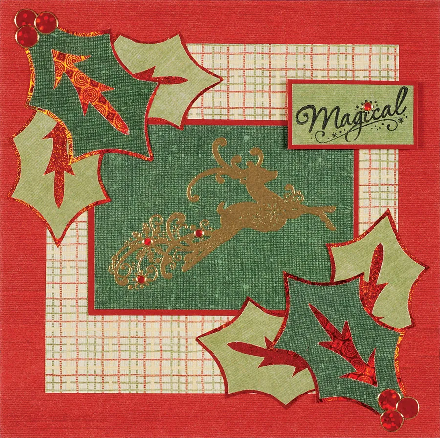 Follow the directions on the template to trace and cut a large jolly holly from Christmas dark green linen paper and small holly from Christmas light green textured paper. Mat both on red holographic paper with 1/16" borders. Cut both holly designs into two 2-leaf pieces. Glue a small holly sprig to the upper left and one to the lower right corner as shown. Cut one large holly sprig into two leaves and glue over the small holly as shown. Stamp “magical” in black on Christmas light green textured paper. Trim to 1 3/8"x¾" and mat on cardstock with 1/32" borders. Foam tape the word and place Dazzles™ as shown.