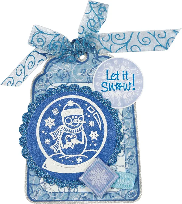 Cut out the light blue Christmas snowflake circle art with a narrow white edge. Stamp “Let it snow” in blue ink, then glue above the globe as shown. Follow the Shape Studio manufacturer’s directions to make an epoxy square embellishment with a Christmas blue/white snowflake behind it. Fold a 1½" light blue grosgrain ribbon in half and tape the ends to the back of the epoxy square. Use tape to adhere the square near the tag bottom as shown.