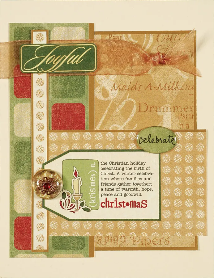 From the CD, copy and size “celebrate” word to 7/8" wide and “joy” to ¾" wide. Print both on Christmas light green textured paper. Copy and size “blessings, wishes for joy…” phrase to 2¾" wide. Print on Christmas ivory paper, then trim to 3¼"x2½", placing the phrase near the upper edge. Carefully tear off the bottom edge.