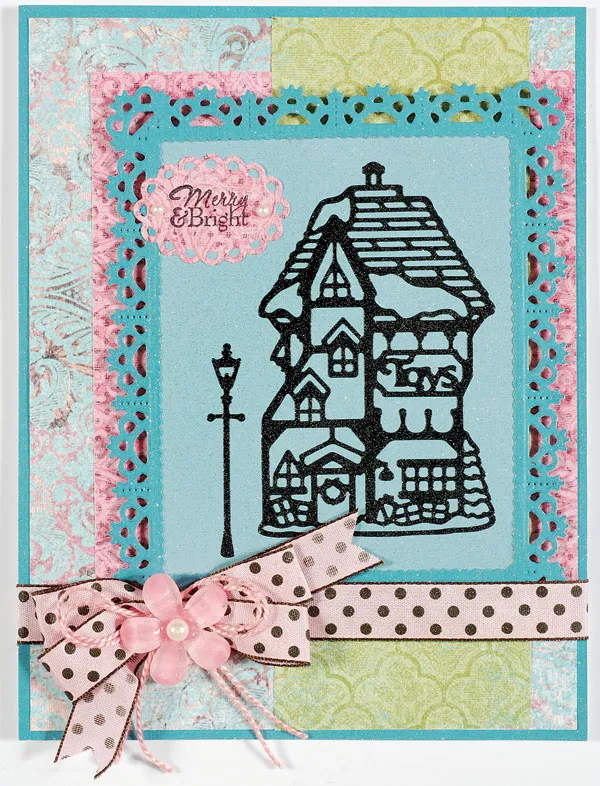 Die cut a 4"x4¾" dusty blue cardstock frame and back the center area with light blue cardstock. Place the Dazzles™ house and lamppost as shown, then foam tape the frame to the front, centered on the pink paper. Wrap a 6" ribbon across the lower edge of the frame and glue the ends under the cardstock. Glue the remainder of the constructed front to the card.