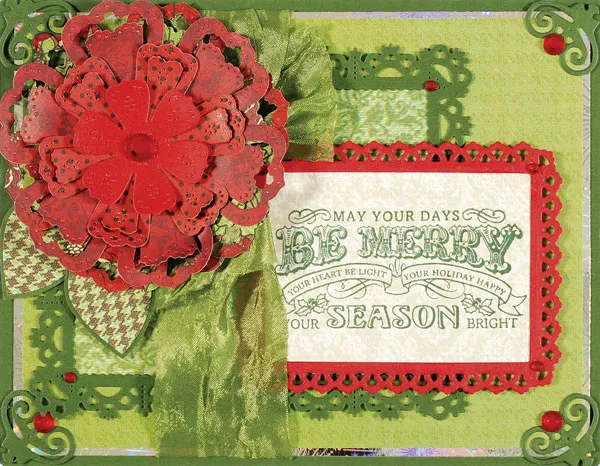 Wrap ribbon vertically across the green paper, 1½" from the left edge, gluing the ends to the back. Tie a 4" ribbon onto the first ribbon, 1¾" from the top, then glue the constructed piece centered on the card front. Die cut a 3½"x2¾" red cardstock frame, then back the center with Red Velvet tan tapestry paper. Stamp “may your days…” in the center, then foam tape to the lower front, ½" from the right edge.