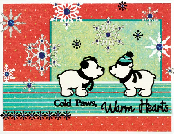 Cut 6¼"x1 1/8" Winter Delights striped paper and mat the long edges on white cardstock with 1/16" borders. Glue to the front, 5/8" from the bottom. Place the two Dazzles™ snow bears on white cardstock, placing the right bear’s hat on Winter Delights striped paper. Cut out the bears and glue to the border as shown.