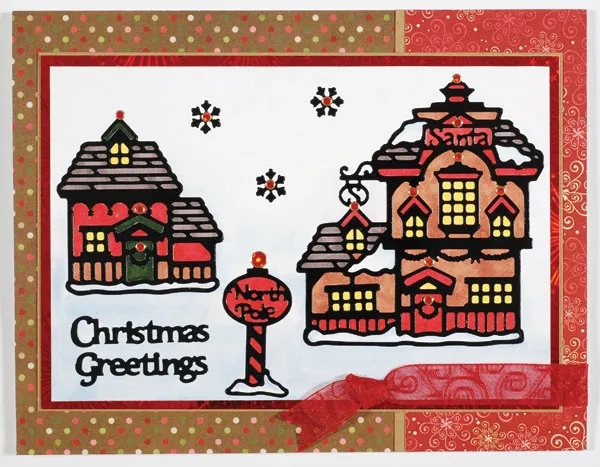 Place the Dazzles™ snowflakes and words as shown. Mat the houses on holographic paper with 1/8" borders, then on tan cardstock with 1/32" borders. Glue centered on the front. Cut a 5" ribbon and knot one end. Glue the knot below the large house, then tuck the end under the red swirls strip and glue. Glue the remainder of the red swirls strip to the front, then place red jewel Dazzles™ as shown.