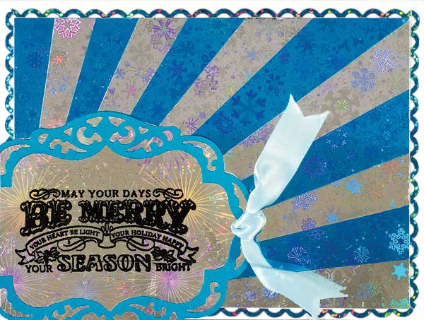 Die cut a 4½"x3½" label from teal cardstock. Cut 5"x4" silver fireworks paper and stamp “may your days…” in the center. Cover with embossing powder, tap off the excess, and heat to melt. Glue the teal frame centered around the greeting, then cut off the excess along the edge. Punch a hole in the right end and tie the ribbon onto the label. Glue the label extending off the lower left corner, then trim the excess.