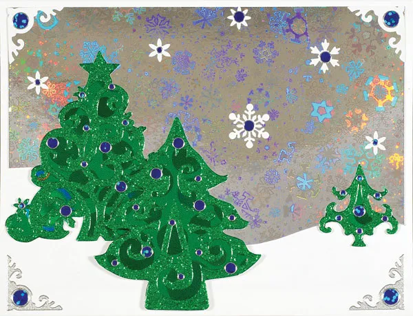 Place White Dazzles™ corners in the upper corners on the Silver Snowflakes Holographic paper, then place Silver Dazzles™ corners in the lower corners, 1/8" from the card edges. Place 3/8"x¾" White Snowflake Dazzles™ evenly across the sky, then decorate the snowflakes, corners, and trees with Blue Jewel Dazzles™.
