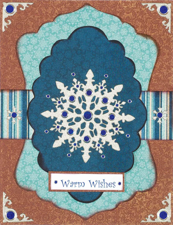 Place the large Snowflake Dazzles™ on the navy label center and embellish with Blue Jewel Dazzles™. Place small snowflakes on the striped border sides and corner Dazzles™ at card corners. Embellish with Jewels. Write or computer print, using Blue ink, “Warm Wishes”. Cut into 1/2” wide strip and mat with Stolen Moments brown paper, leaving 1/16” border. Place Tiny Jewels on each side. Glue to the bottom of the Scalloped Oval shape.