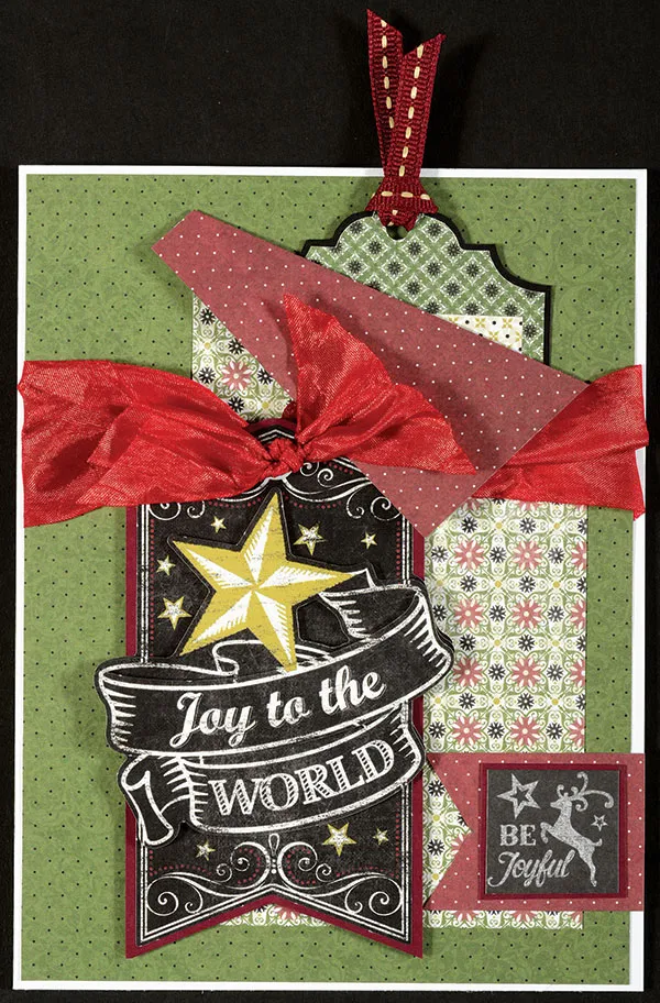 Follow the package directions to punch out and assemble the paper tole “Joy to the World” tag, and mat it on maroon cardstock with 1/16" borders. Punch a hole at the top. Cut the red ribbon in two 6" pieces, then tie one end of each together. Insert the long ends through the hole in the tag and pull the knot to the tag. Foam tape the tag to the papers, ¾" from the left edge. Wrap the ribbon ends to the back of the green paper and glue. Glue the constructed front to the card.