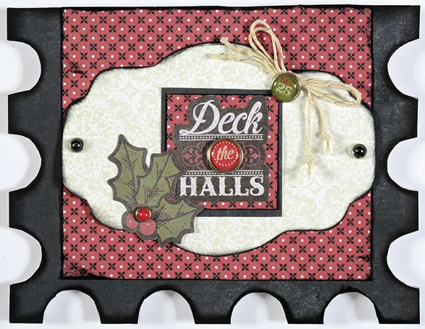 Ink edges of 5”x4 1/4” Christmas Cheer red paper and glue even with the card fold. Trace the Bookplate Label onto Christmas Cheer ivory paper and ink edges. Secure Christmas Cheer Embellies™ black mini brads on each side. Mat 1 3/4”x2” Christmas Cheer red paper with black paper, leaving 1/8” border. Glue “Deck the Halls” Christmas Cheer Embellies™ to the center and secure the red brad. Glue to the center of the ivory label. Glue holly Embellies™ at the bottom left. Hold 2 lengths of Sparkle Silver Twine Cording together and tie a bow. Knot ends and cut to 1”-1 ¼” long. Zot the bow under the “Dec. 25” brad and secure brad at the top right corner of the label. Glue the label to the card center.