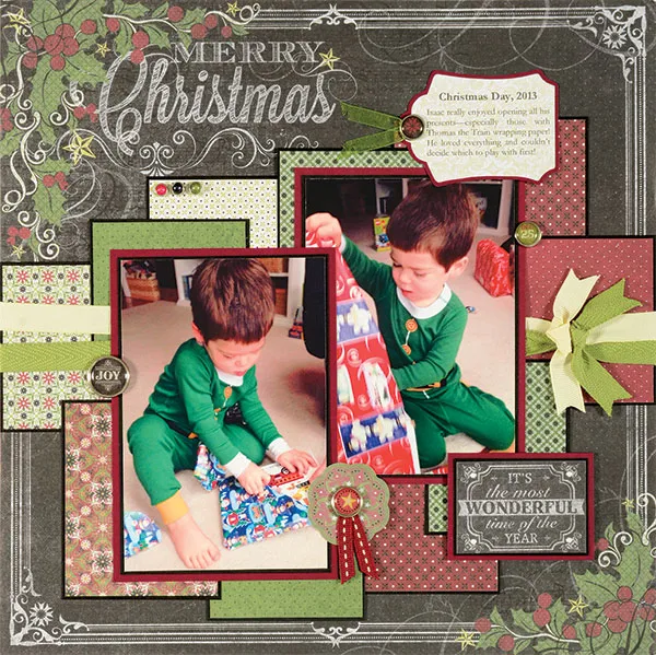 Computer journal the action in the photos, fitting it to 2¼"x1½", then print onto Christmas Chalkboard Cheer ivory lace paper. Trace the Persian tag around the journaling, cut out, and mat on maroon cardstock with 1/16" borders. Insert a ½" Embellies™ in the tag, wrapping the sheer ribbon around the prongs before flattening. Glue the tag to the page at the upper right. Insert the remaining Embellies™ around the photos as shown.