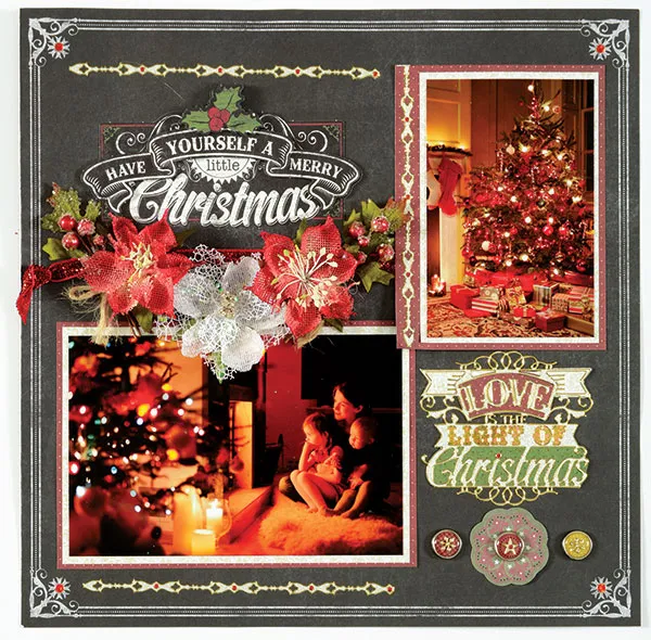 Assemble the Joyous Greetings “Have Yourself….” Paper Tole with foam tape. Glue to the top left 1½” from the top, and 1¼” from the left edge. Knot a 9” glitter ribbon on one side. Zot™ the knot to the left edge, 5” from the top. Glue across the page, and tuck under the left photo. Zot™ two berry sprigs under the Paper Tole, on the left and the right. Glue a White Glitter Poinsettia centered just under the ribbon. Glue Red Poinsettias to the left and right of the white flower.