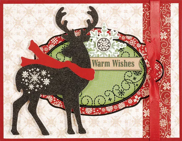 Cut out the Eggnog “warm wishes” label, then glue the 1½" snowflake die cut and foam tape the remaining pieces as shown. Place pearls on the deer’s snowflakes and on the small snowflake die cut.
