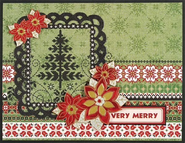 Punch out the Eggnog black frame and remove the nibs, then cut out the “very merry” label. Mat the label on cardstock with 1/32" borders, then glue to the lower front, 5/8" from the right edge. Glue the frame around the printed tree as shown.