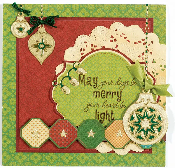 Assemble a string of Dazzles™ lights across the label at the upper left, using gold and green components. Place a gold Dazzles™ star in the center of each quilt block. Cut the ribbon in half, then knot one half and glue to the large ornament top. Tie a double-thread bow and glue to the oval ornament. Knot two threads together, trim the ends, and glue to the smallest ornament.