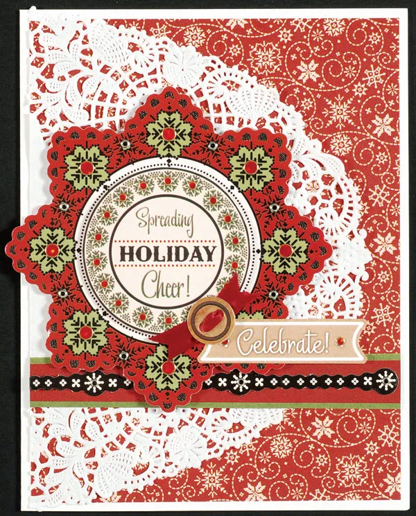 Foam tape the red snowflake to the doily, extending ¼" off the left card edge. Cut out the Eggnog “celebrate” banner and “spreading holiday cheer” greeting. Foam tape the greeting to the snowflake center, then glue and foam tape the banner as shown.