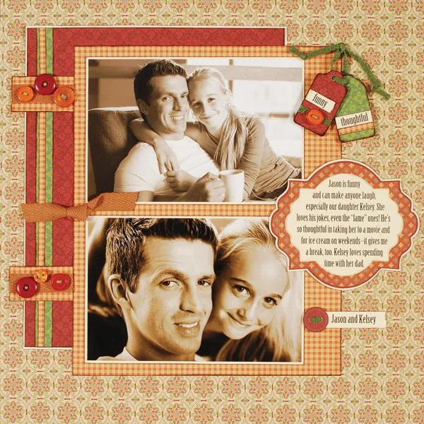 Right page: Glue a 4 1/2" length of caramel twill to the right side of the orange plaid photo mat. Tie a knot in a 5” length of twill, 2” from the left. Wrap the bottom photo with the twill with the knot 1” from the left, gluing ends on the back. Zot™ assorted buttons to the twill pieces as shown.