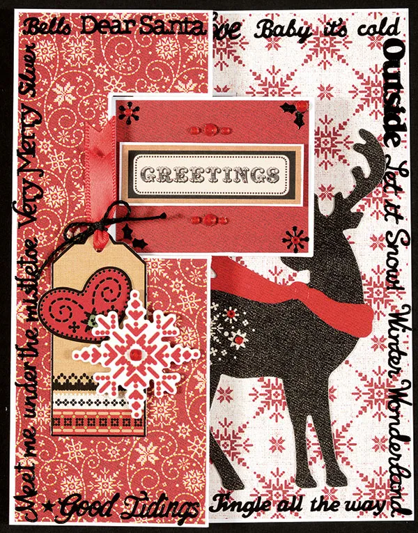 For the papers: Trace or photocopy the paper patterns included in the rectangle swing card package, then cut them out. Trace and cut the left side paper pattern from Eggnog red/white stitching paper and the right side pattern from white/red snowflakes paper. Glue in place. Cut the spine from Eggnog striped paper and glue in place.