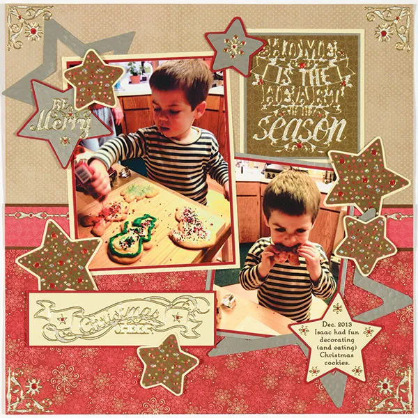For the sugar cookies, trace and cut rounded star 4 three times and basic star 3 twice from Christmas Sweets brown dotted paper. Mat each on ivory cardstock with 1/16" borders. Cut a basic star 3 and a rounded star 4 from silver paper and mat each on red cardstock with 1/16" borders. Place Dazzles™ “Be Merry” on the larger silver star, and then glue and foam tape the stars and cookies around the photos as shown.