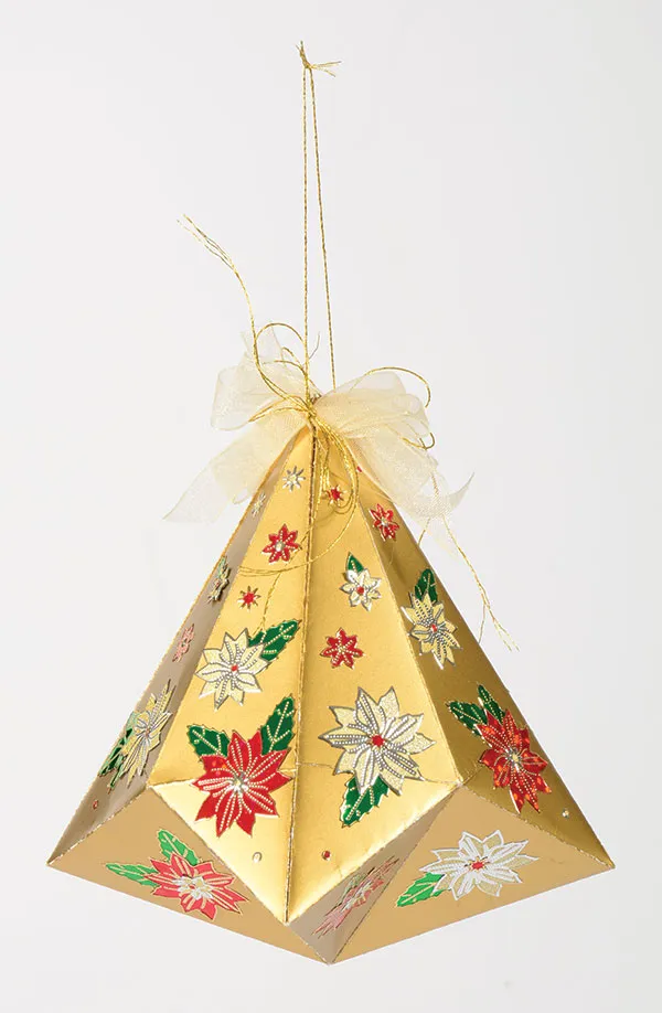 Use the needle to insert an 8" thread through the top. Tie the thread ends together for a hanger and trim the ends. Decorate the panels with the Dazzles™ poinsettias, alternating the colors.