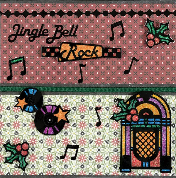 Use the same method of cutting a Double Sided Adhesive large enough for the holly, records, music note, and Rock Dazzles™. Use the following Spectrum Noir markers to color: Holly DR6 JG7, Rock DR6, & TN7, Large record TN7 & PL3, Small record GB9, & TN7. Cut close to each of the Dazzles™ edges. Foam tape these pieces as shown. Add the border along the top, and the extra music notes as shown.
