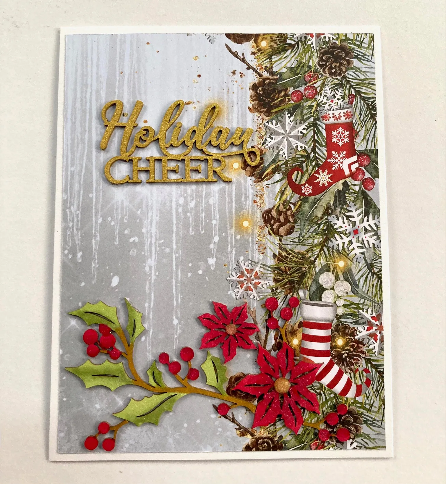 1. For the card front: Place the card with the fold on the left. Cut 4¾"x6¼" Sparkling Season stockings border cardstock and glue it centered on the front. Remove the “holiday cheer” chipboard from the backing and place it on the craft mat. Spray it with the Glamour Gold mist and set it aside to dry.