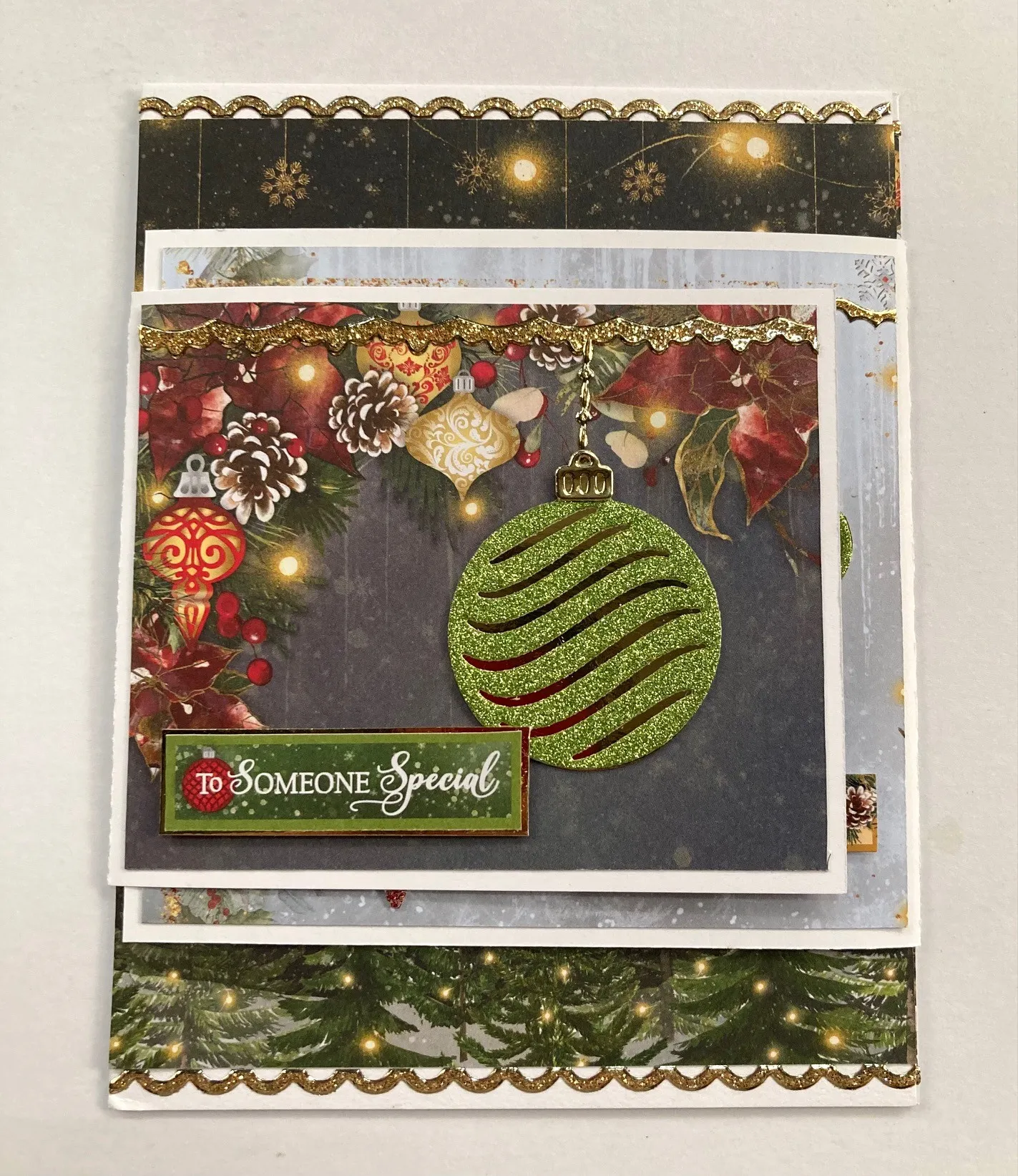 3. For the small front flap: Cut 4¼"x3½" Sparkling Season blue border cardstock and glue it centered on the small flap front. Place border Dazzles™ near the top, trimming the excess. Die cut the round ornament from lime glitter cardstock, then glue it to gold mirri and cut along the edges. Die cut an ornament top from mirri and glue it to the front. Glue the ornament to the small flap as shown, adding a border Dazzle™ as a chain. Mat the “to someone special” label on rich gold mirri with narrow borders and foam tape it to the flap at the lower left.