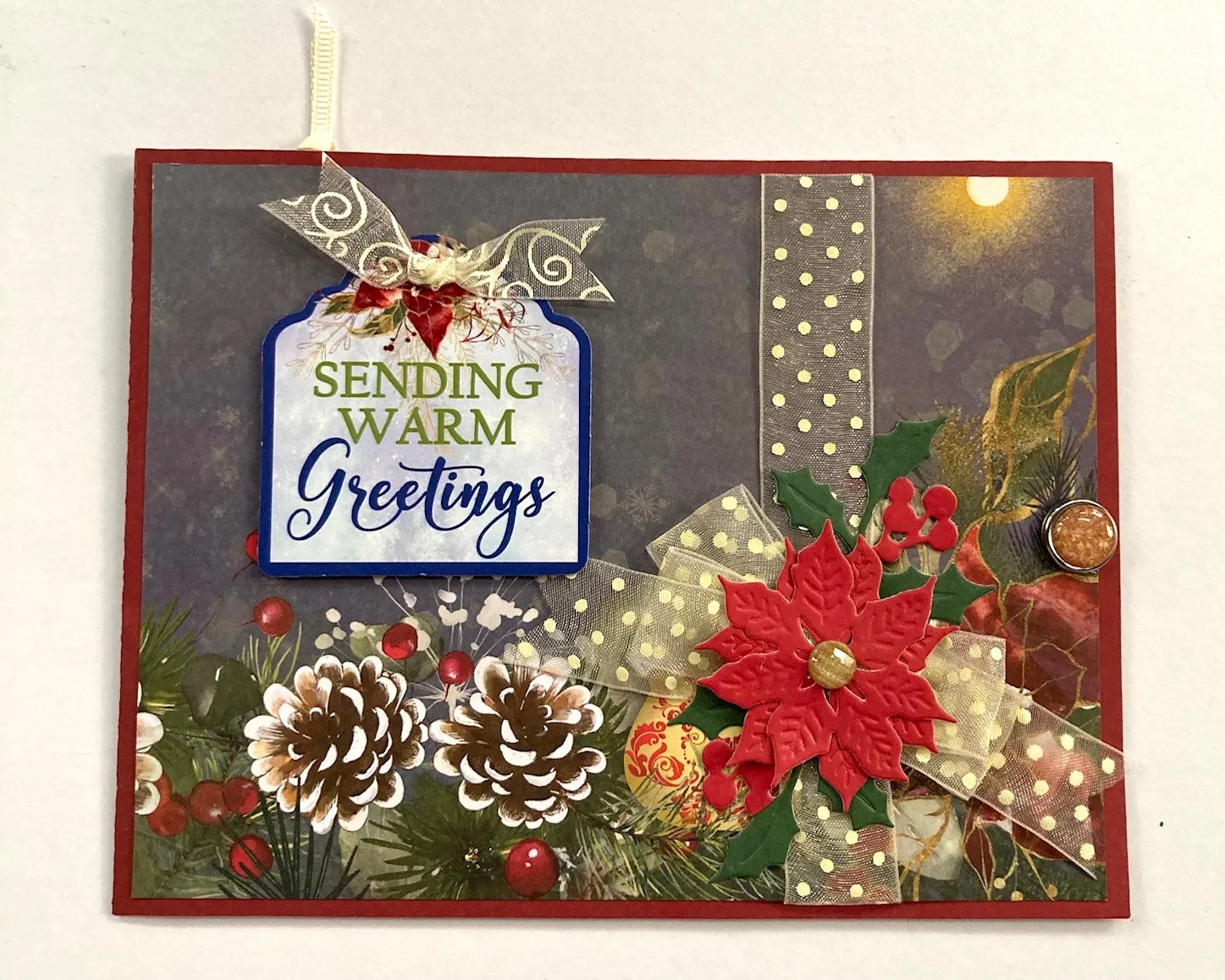 3. Make a 4-loop bow with the same ribbon and tie the center with thread. Glue the bow over the first ribbon, 1½" from the bottom. Die cut the small holly branch twice from green cardstock and twice from red cardstock. Cut the red berries off the stems and glue them to the berries on the green die-cuts. Glue the branches extending from the bow center as shown. Die cut two red cardstock poinsettias, then stack and glue them together. Glue the flowers to the bow.