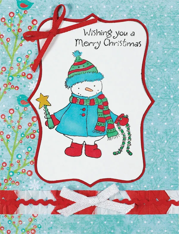 Card front: Cover the card with blue tree border paper. Stamp the standing snowman and color as for the inside snowman. Stamp greeting at the top right. Trace around snowman using Bracket Label, 3 1/2”x4 3/4&rdquo,; cut out and mat with red cardstock, leaving a 1/16” border. Glue to the card front. Glue a red bow to the left corner.