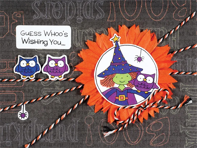 Cut out all images leaving a 1/16” border. Cut out the greetings in rectangles, slightly rounding the corners. Glue the witch circle to the center of the orange fabulous flower on the front of the card. Glue “Guess whoo’s wishing you…” 3/4” from the top and 1/2” from the left. Foam tape two owls perching on the horizontal twine as shown. Glue a hanging spider from the middle piece of twine in the bottom left as shown. Zot™ a small bow of twine to the lower right of the witch circle image.