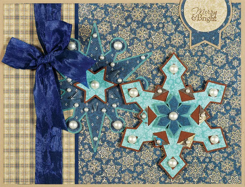 Cut Comet layer 2 from Fresh Frost blue textured paper and Blitzen layer 3 from teal snowflakes paper. Mat each on brown cardstock with 1/16" borders, then foam tape the small snowflake on the large snowflake. Glue to the inside and place pearls as shown.