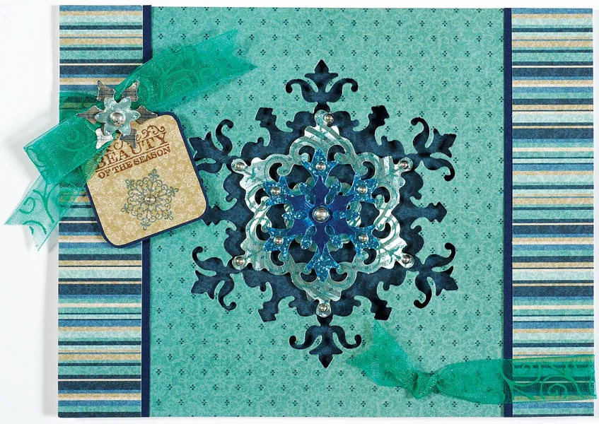 Use the template to trace and cut squared tag A from Fresh Frost tan snowflakes paper. Mat on navy cardstock with 1/32" borders, then stamp “beauty of the season” near the top with Dark Brown ink. Stamp a ¾" snowflake near the bottom with Chambray, then foam tape the tag below the bow. Punch out a 1" tan and a ½" aqua foil snowflake. Foam tape the ½" snowflake to the 1" snowflake, then attach to the bow center with tape. Place pearls as shown.