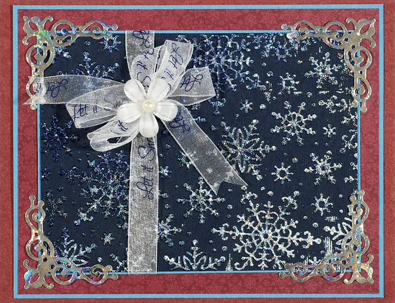 Mat the snowflakes on light blue cardstock with 1/32" borders. Wrap ribbon vertically, 1½" from the left end and glue the ends to the back. Make a 6-loop bow and tie the center with thread. Attach to the first ribbon with tape, 1¼" from the top, then glue the snowflakes centered on the front. Die cut four inner corners from Snowflakes Holographic paper and glue one to each corner. Attach a pearl blossom to the bow center.