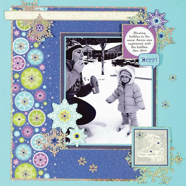 For the page: Mat the Winter Wishes border paper on holographic paper with 1/8" borders, then glue to aqua cardstock, 1 7/8" from the right edge. Die cut one 3¾", five 2", and fourteen 5/8" snowflakes from silver holographic paper. Punch out the Winter Wishes snowflakes shown and remove the nibs. Cut out the purple blank circle label and the ‘brrr” conversation bubble.